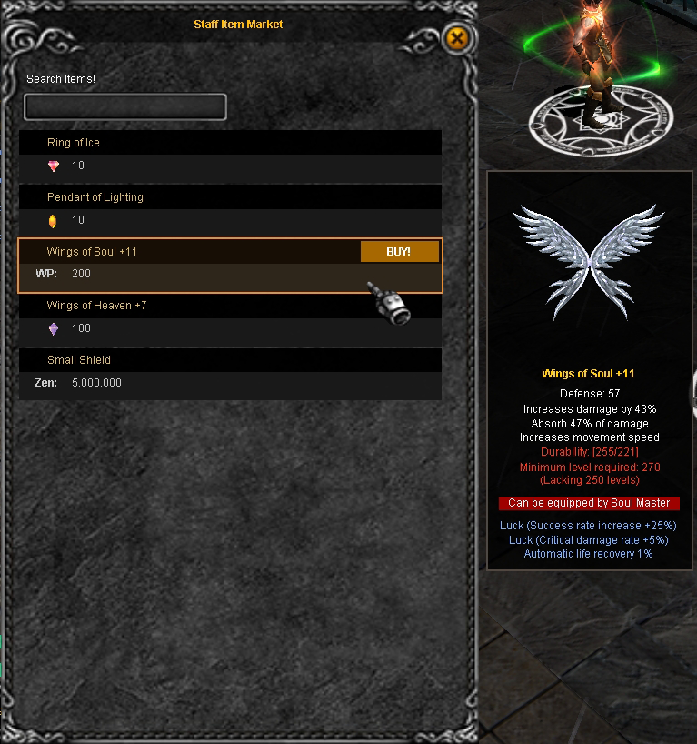 By selecting one of the Markets from the list, the available items will be displayed with their preview and price so you can buy instantly.